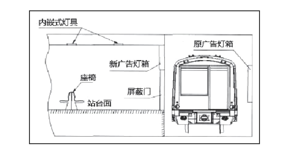 部分光源配置方案的制定对于照明度构成情况的调查总结存在不足,尤其对于照明灯具数量的控制措施关注程度较低,导致屏蔽门相关装置在具体安装的过程中,无法充分的满足屏蔽门和相关灯带的设置需要,难以保证灯具的布局策略得到创新调整。一些光源配置策略的制定对于灯槽的设置合理地重视程度较低,缺乏对地铁站运营特征的完整分析,导致站台相关照明技术应用方案的制定无法与照明需求保持一致,不利于灯具安装总体方案的改进。部分广告灯箱的光源配置无法充分满足广告内容的宣传需要。如图所示,内嵌式灯具的占比过高,无法使光源与内容呈平行状态,无法难以提升广告标语的醒目度。